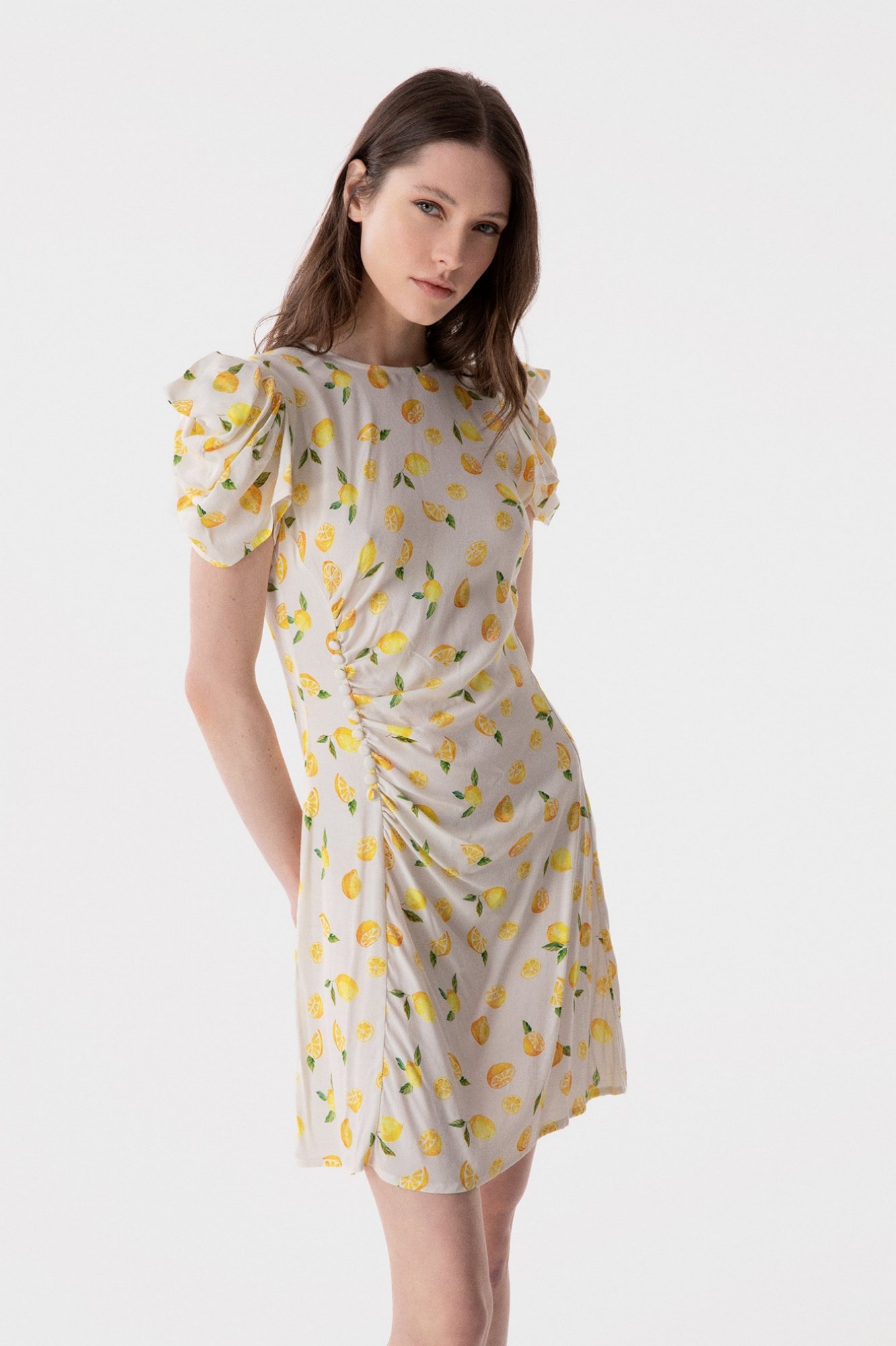 Karin - Short Dress with Drape and Buttons in Crepe