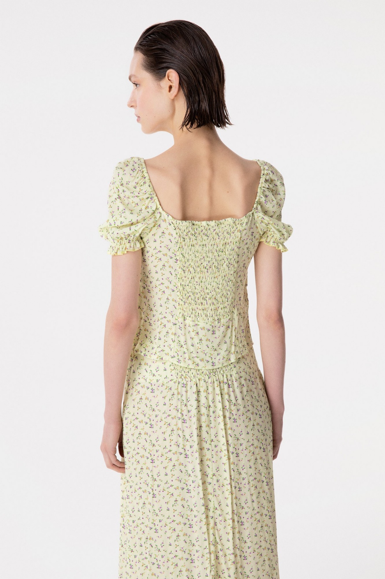 Letizia - Half-Sleeve Crepe Top with Ruffles on the Chest and Cuffs